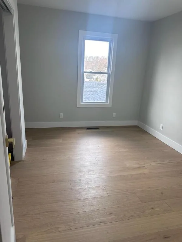 This project involved a complete bedroom renovation, transforming a deteriorated space into a clean and modern environment. Initially, the room had damaged walls, an outdated closet, and a worn-out floor. Through the renovation process, the old materials were removed, and new drywall, flooring, and trim were installed. Additionally, fresh paint in a soft gray tone was applied to create a bright, welcoming atmosphere. As a result, the combination of light oak flooring, white trim, and minimalist design produced a balanced and contemporary finish.