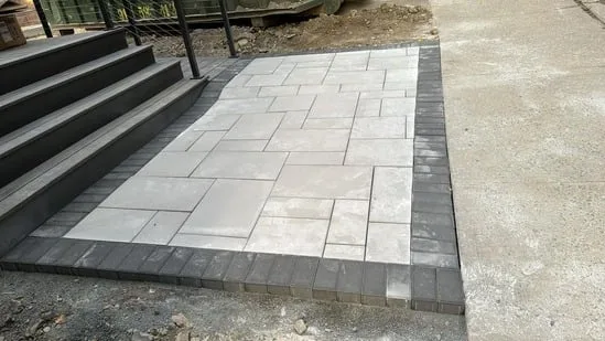 This project involved a patio paver installation designed to improve the transition from the main walkway to the raised stair platform. Additionally, the use of light gray pavers framed with darker stone creates a striking contrast, providing both durability and a modern look. Moreover, the layout was carefully planned to ensure smooth integration with the steps and railings, enhancing accessibility and visual appeal.